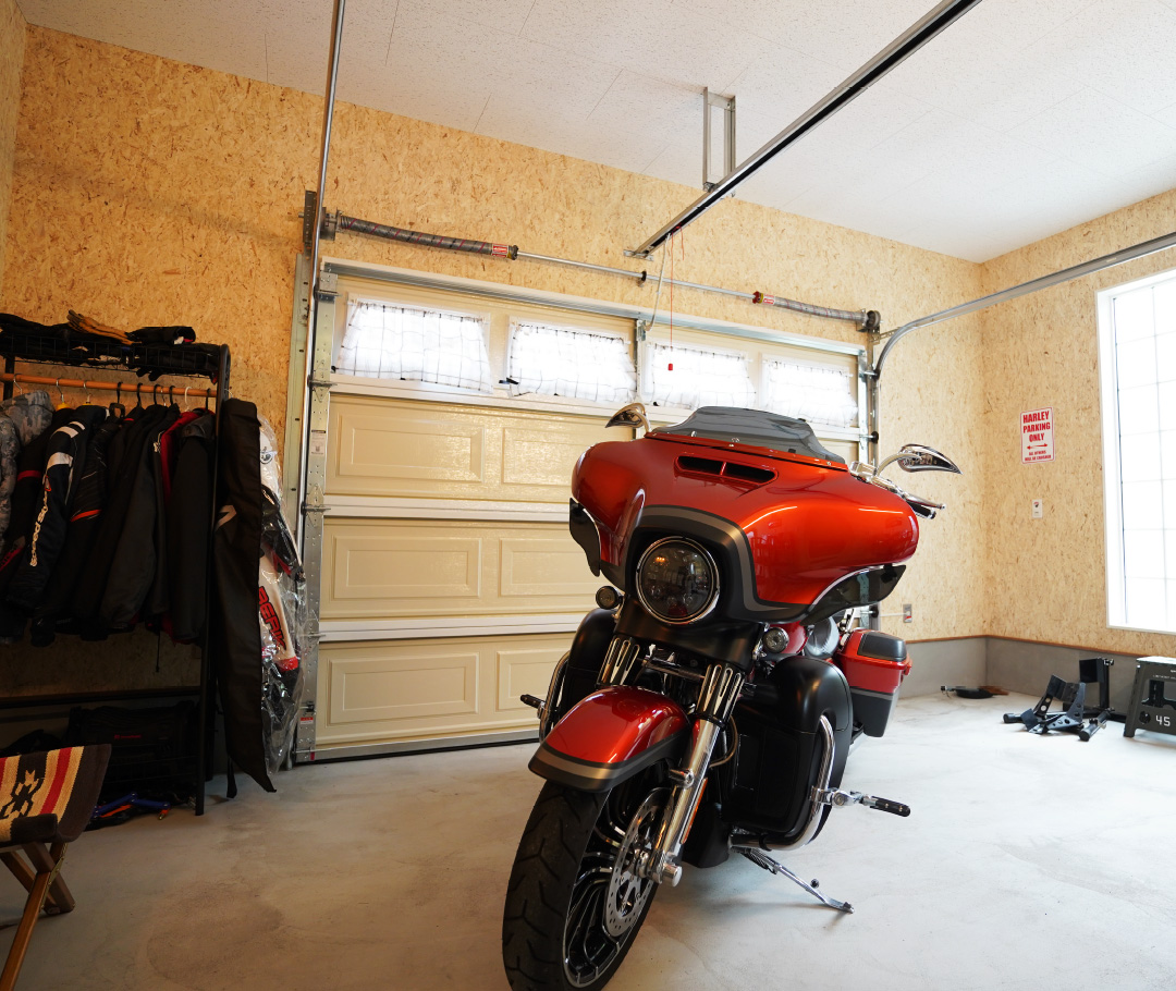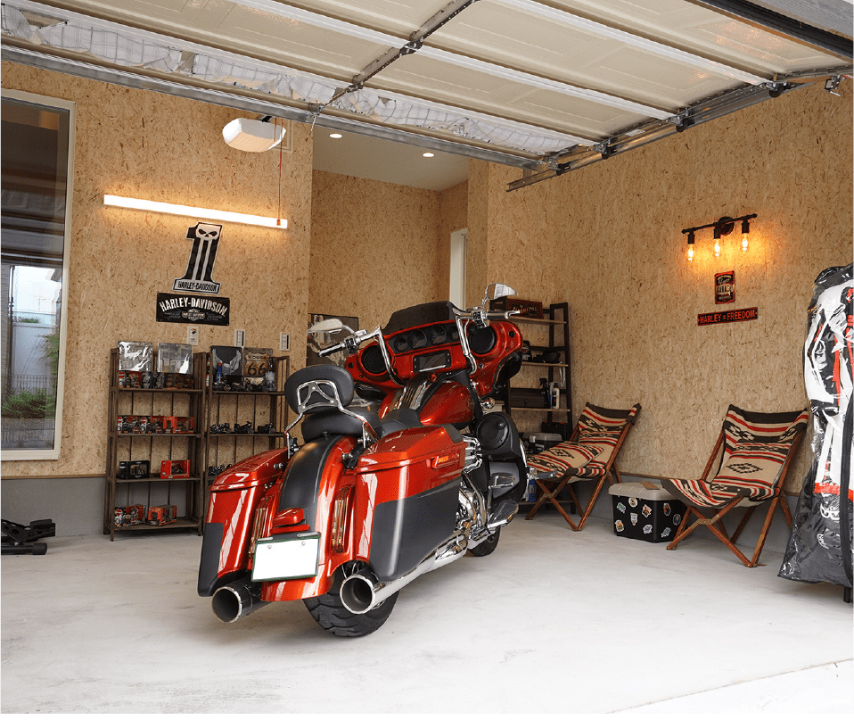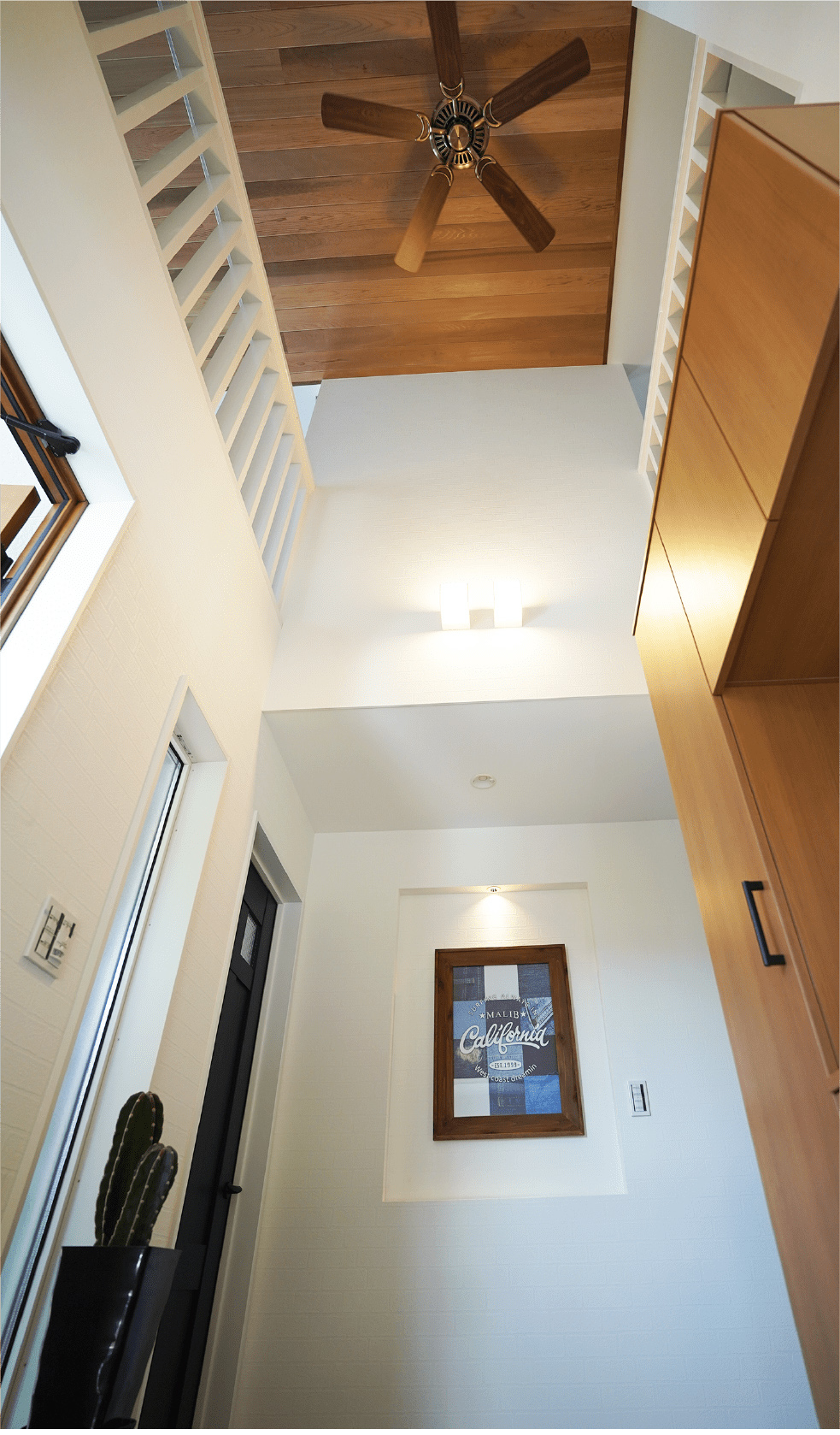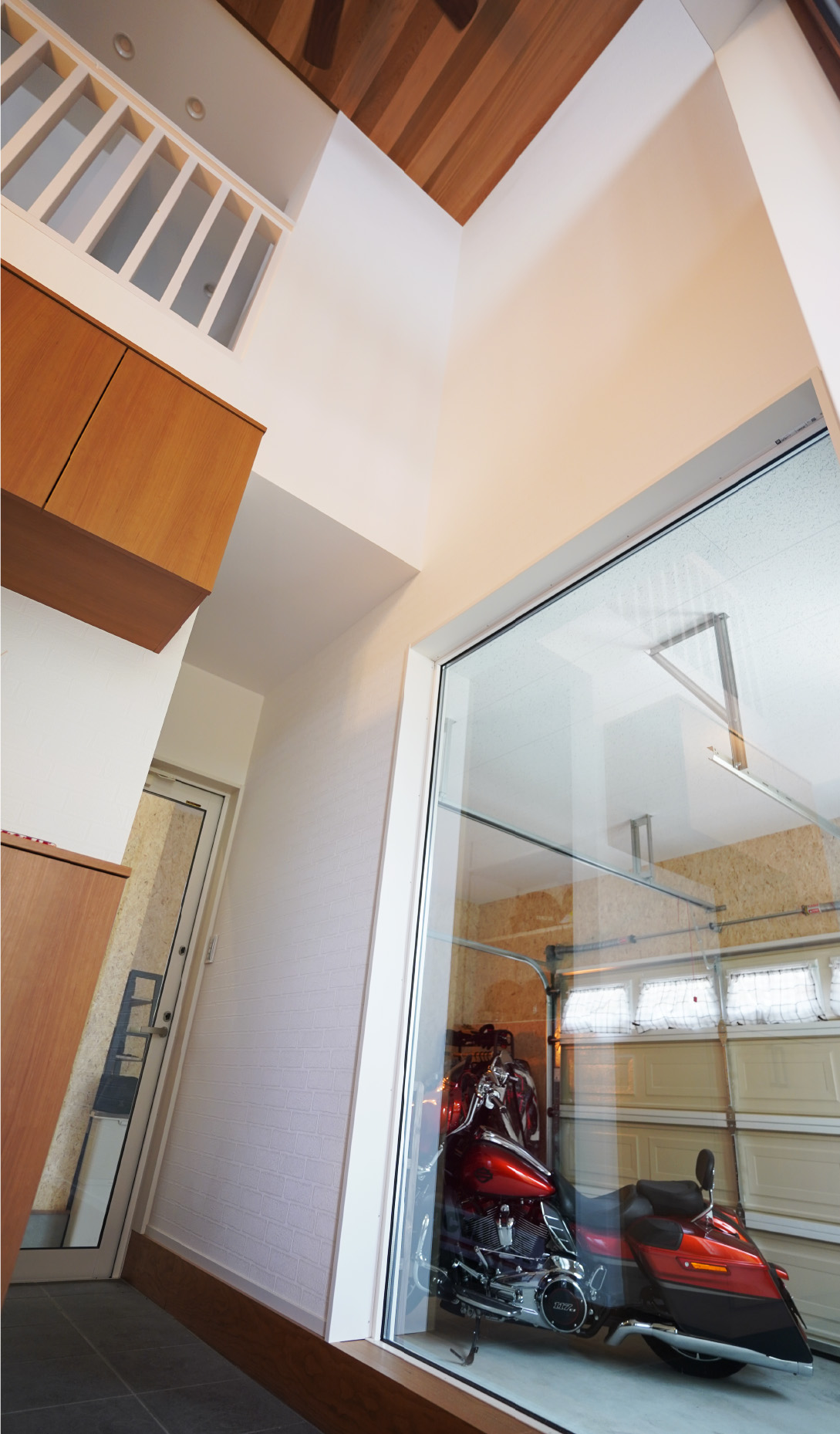 玄関に入ると、大きな吹き抜けと隣接するガレージを
