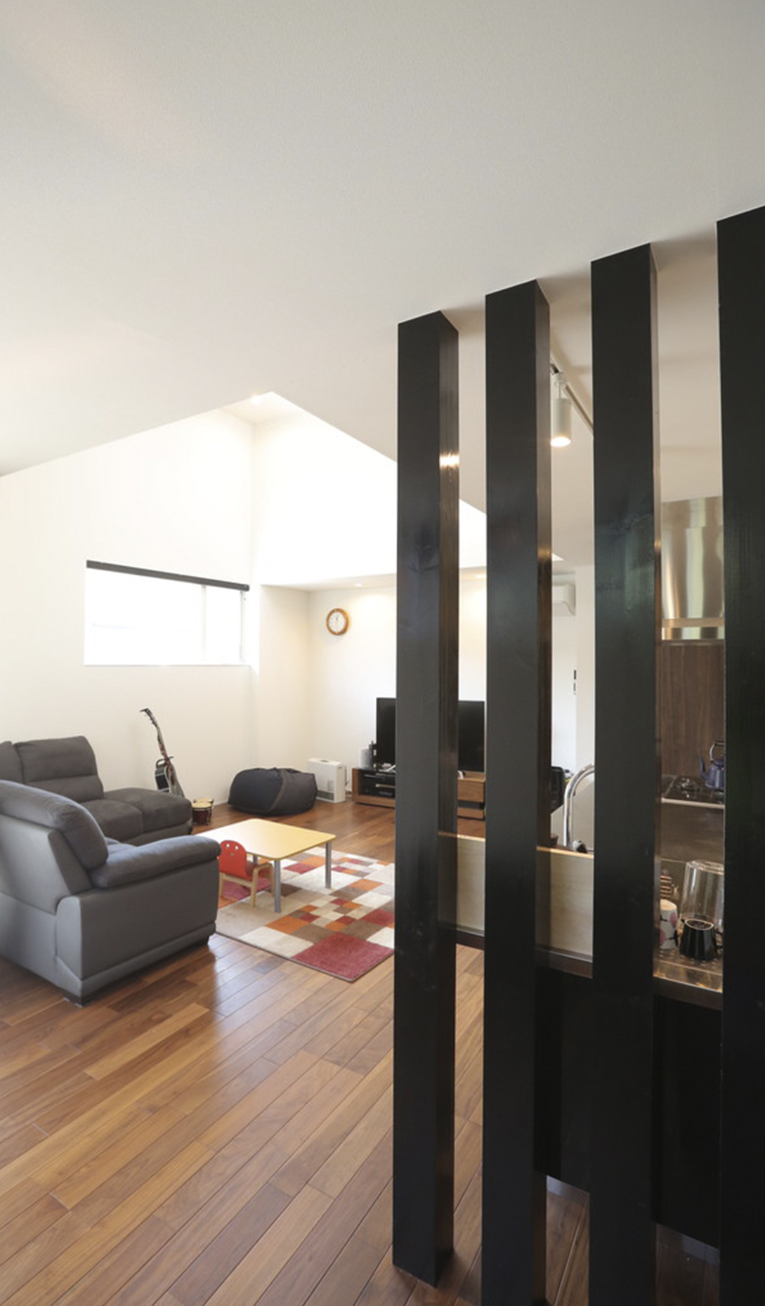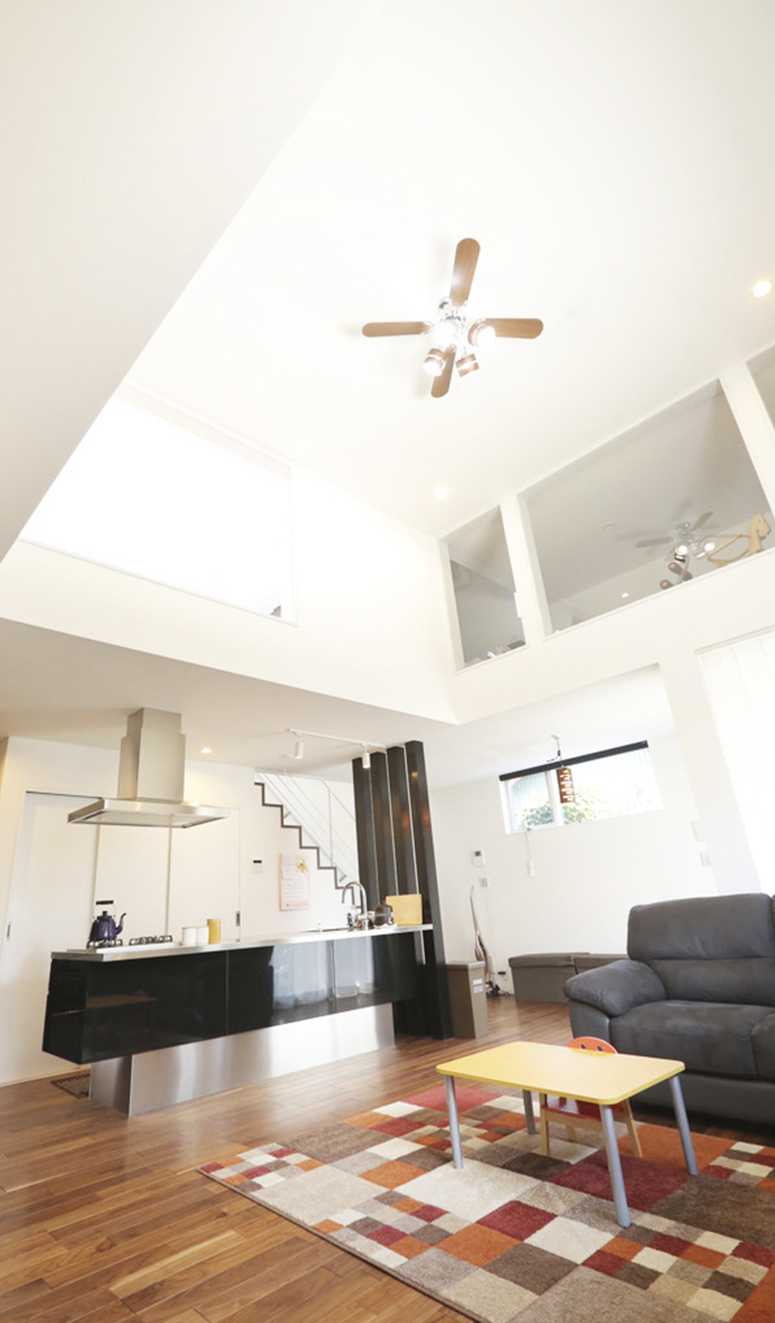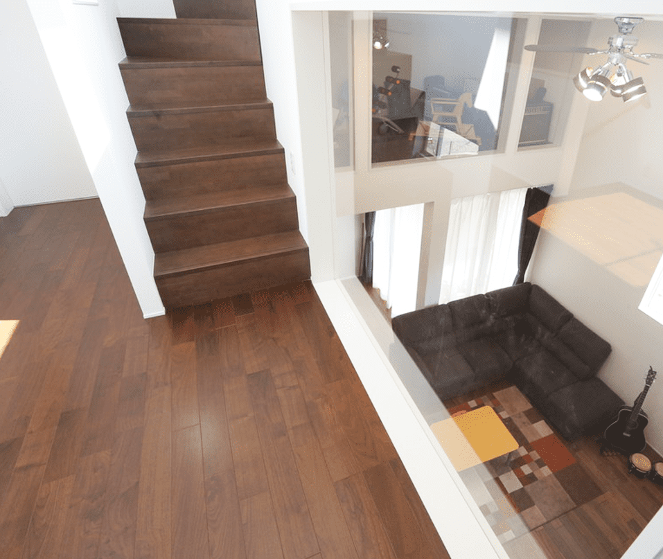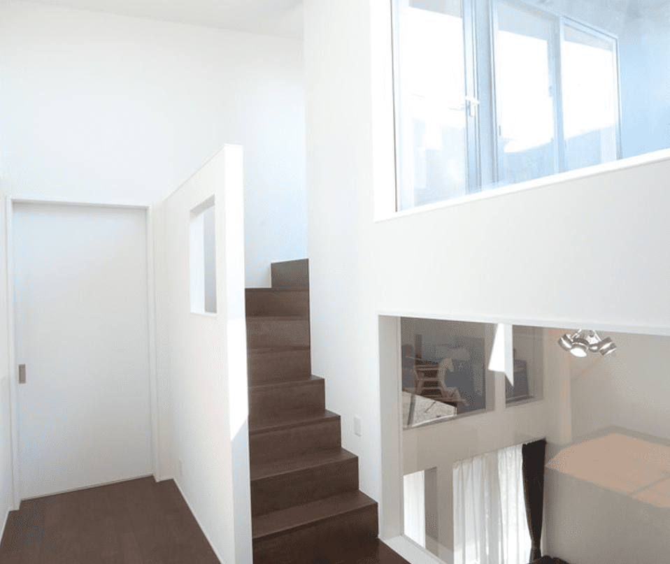 2階の各部屋から窓を介して1Fを眺めることができる構造。